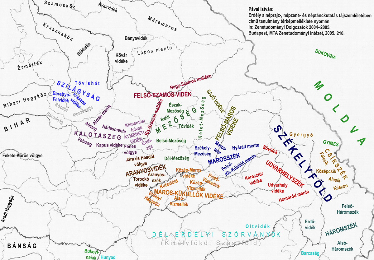 Dunántúl (Transdanubia), Felföld (Upland), Alföld (Great Plain), Erdély (Transylvania), Moldva (Moldavia). Map by István Pávai and György Abonyi. In: Hungarian Heritage. Roots to Revival. Smithsonian Folklife Festival – Washington D.C., June 26–June 30 and July 3–July 7, 2013.